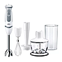 Tackle a wide range of kitchen tasks with the powerful 1000W Braun MQ5237WH hand blender, presented in a white and grey design. Precisely control texture with 21 variable speeds plus a TurboBoost for extra power, while POWERBell Plus technology with its extra milling blade ensures finer, faster blending. SPLASHControl technology minimizes mess. This highly versatile set includes a 600ml beaker, a stainless steel whisk, a 500ml chopper, and a 1.25L food processor attachment equipped with chopping, coarse/fine slicing, and coarse/fine shredding inserts, transforming ingredients effortlessly. Attachments swap easily with the EasyClick system, and detachable parts are dishwasher safe for simple cleanup.